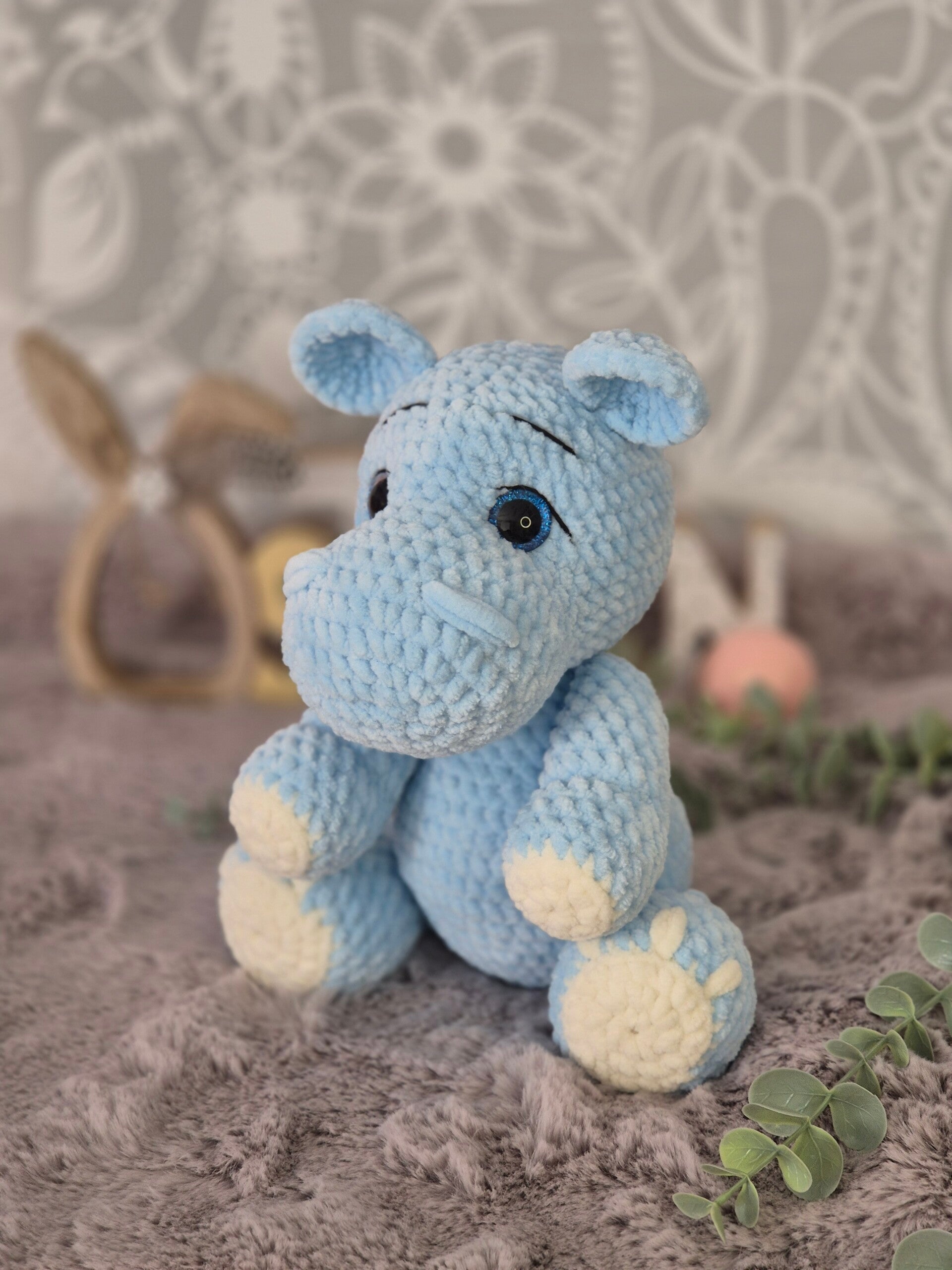 Mit seinem sanften Hellblau, den strahlend blauen Glitzeraugen und seiner gemütlichen Ausstrahlung lädt er sofort zum Kuscheln ein.